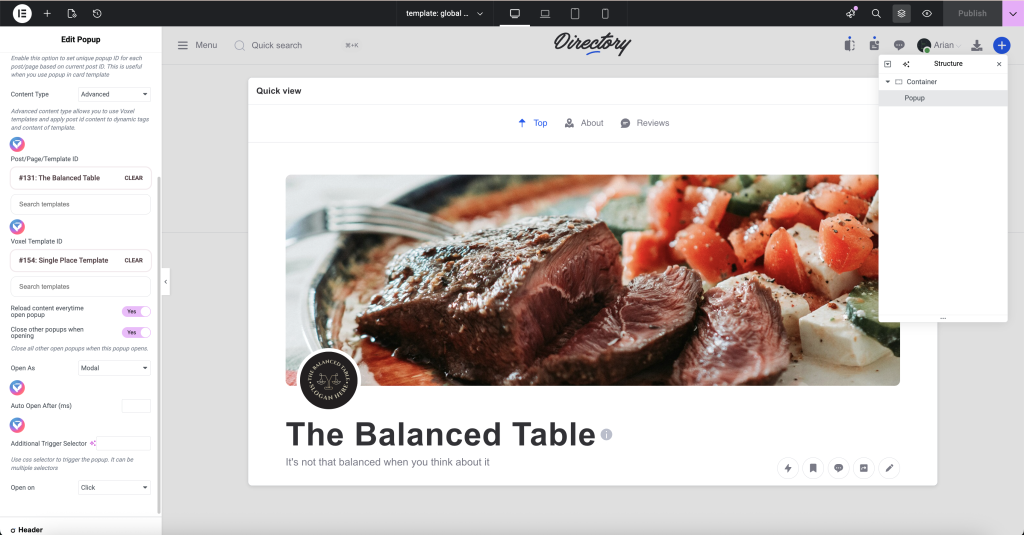 Popup is an addon that allows you to create popups using the Voxel popup interface and load either a template or an Elementor page.